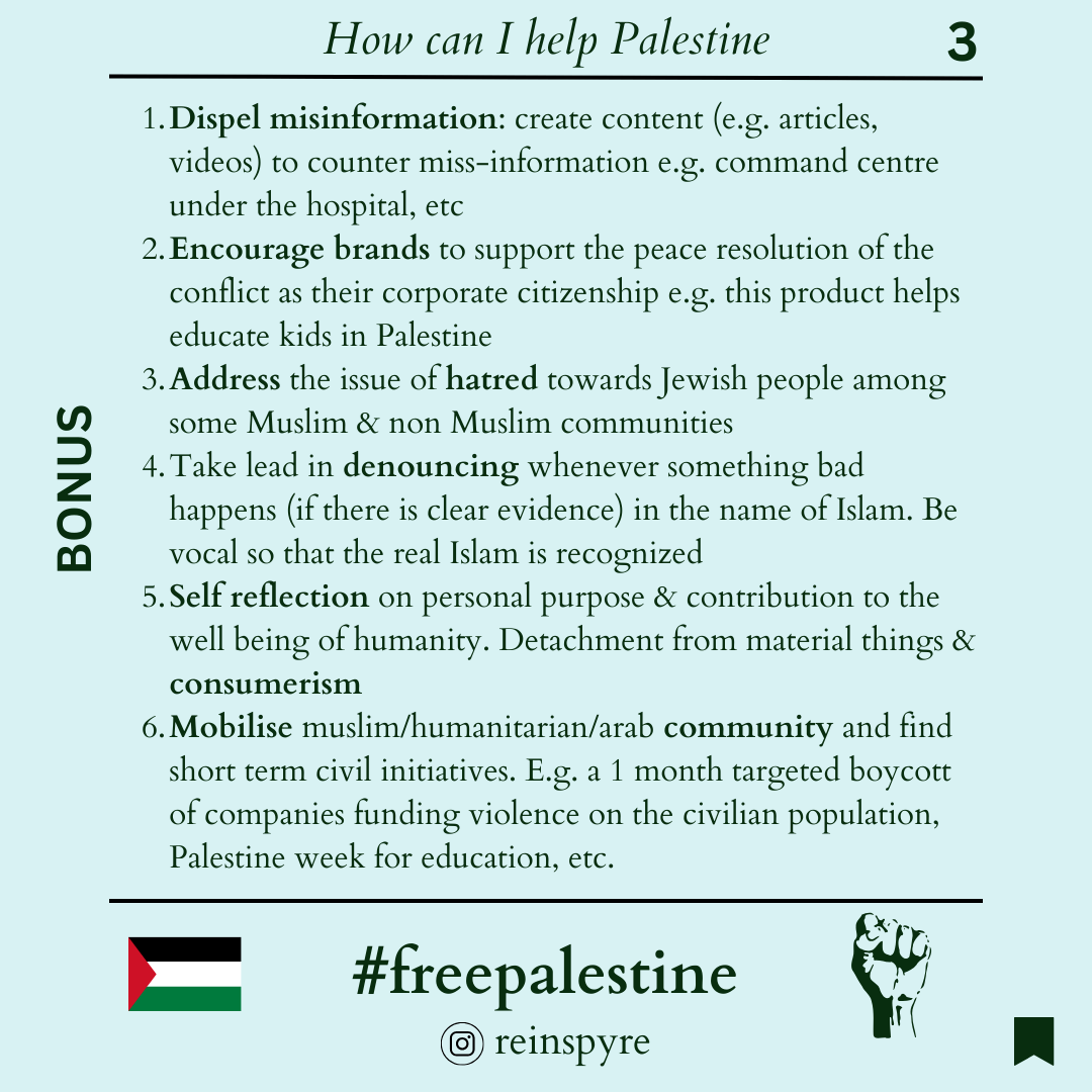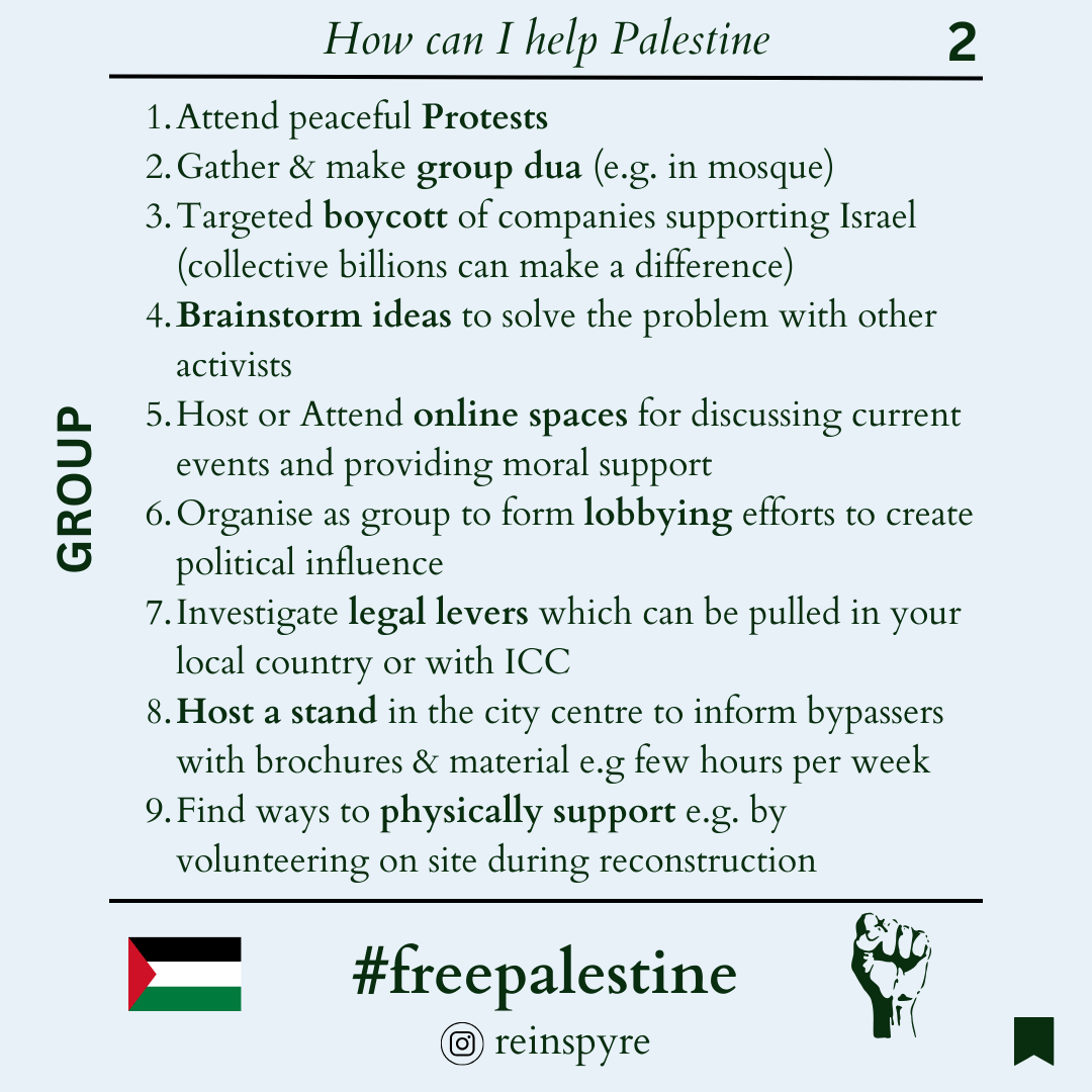 - Mobilise muslim/humanitarian/arabian community & find short term civil initiatives. E.g. a 1 month targeted boycott of companies funding violence on the civilian population, Palestine week for education, etc.