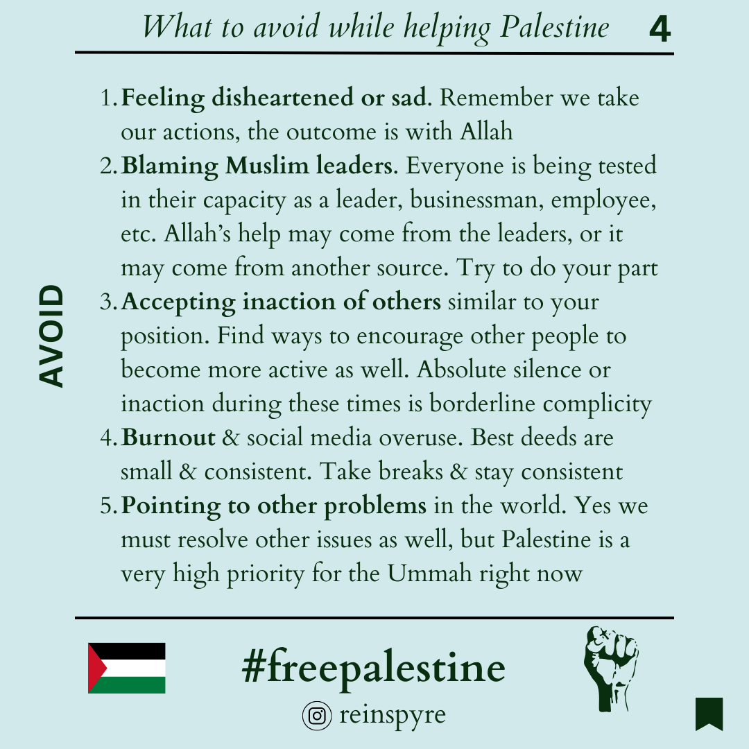 […] This does not lift the responsibility to do our part which could be making Dua, doing Boycotts, raising awareness, attending peaceful protests, giving charity, etc. See more ideas here on How to Help Palestine […]