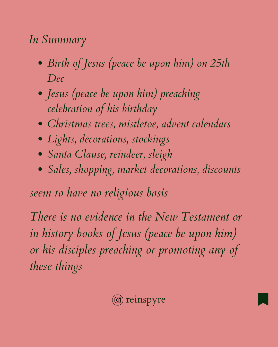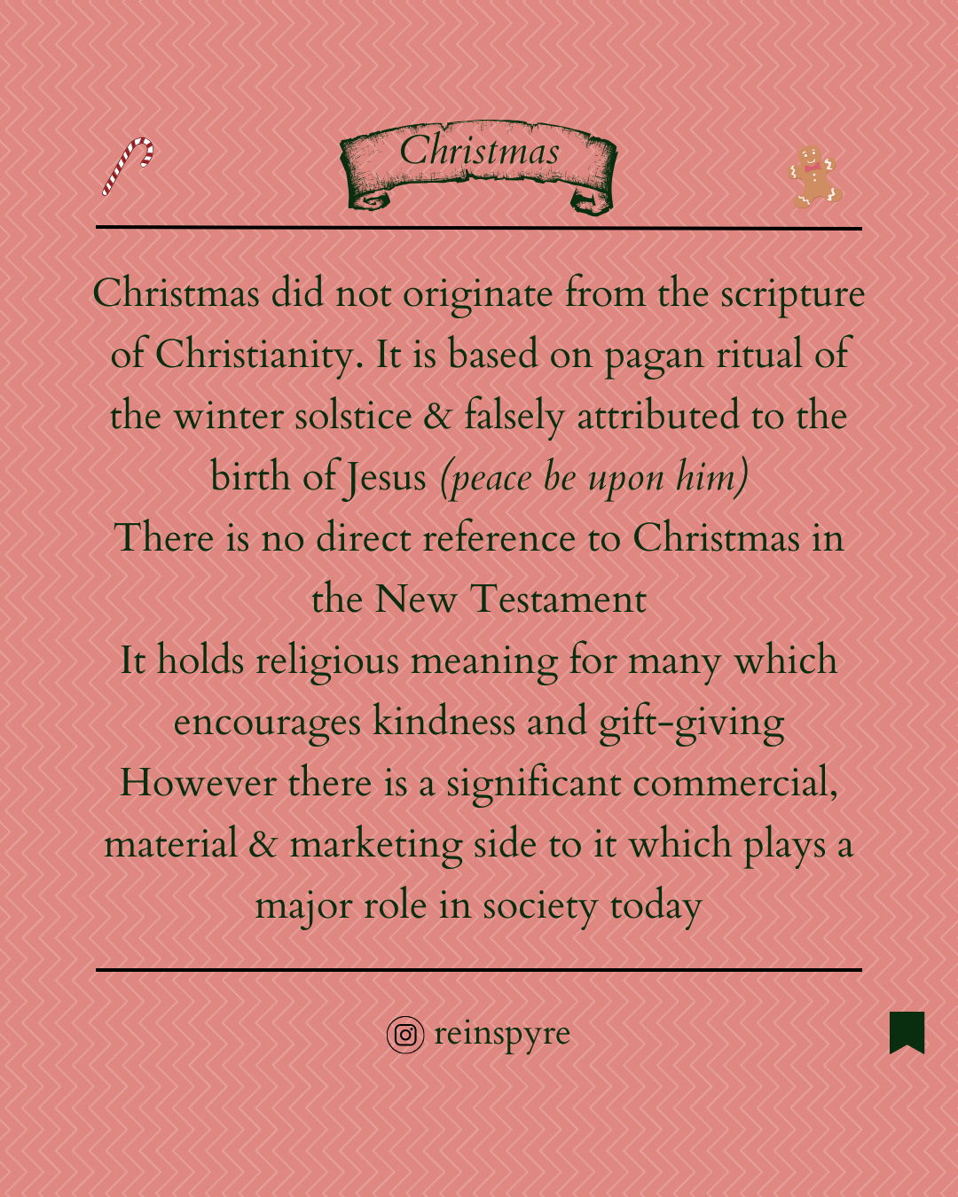 Christmas did not originate from the scripture of Christianity. It is based on Pagan ritual of the winter solstice & falsely attributed to the birth of Jesus (peace be upon him)