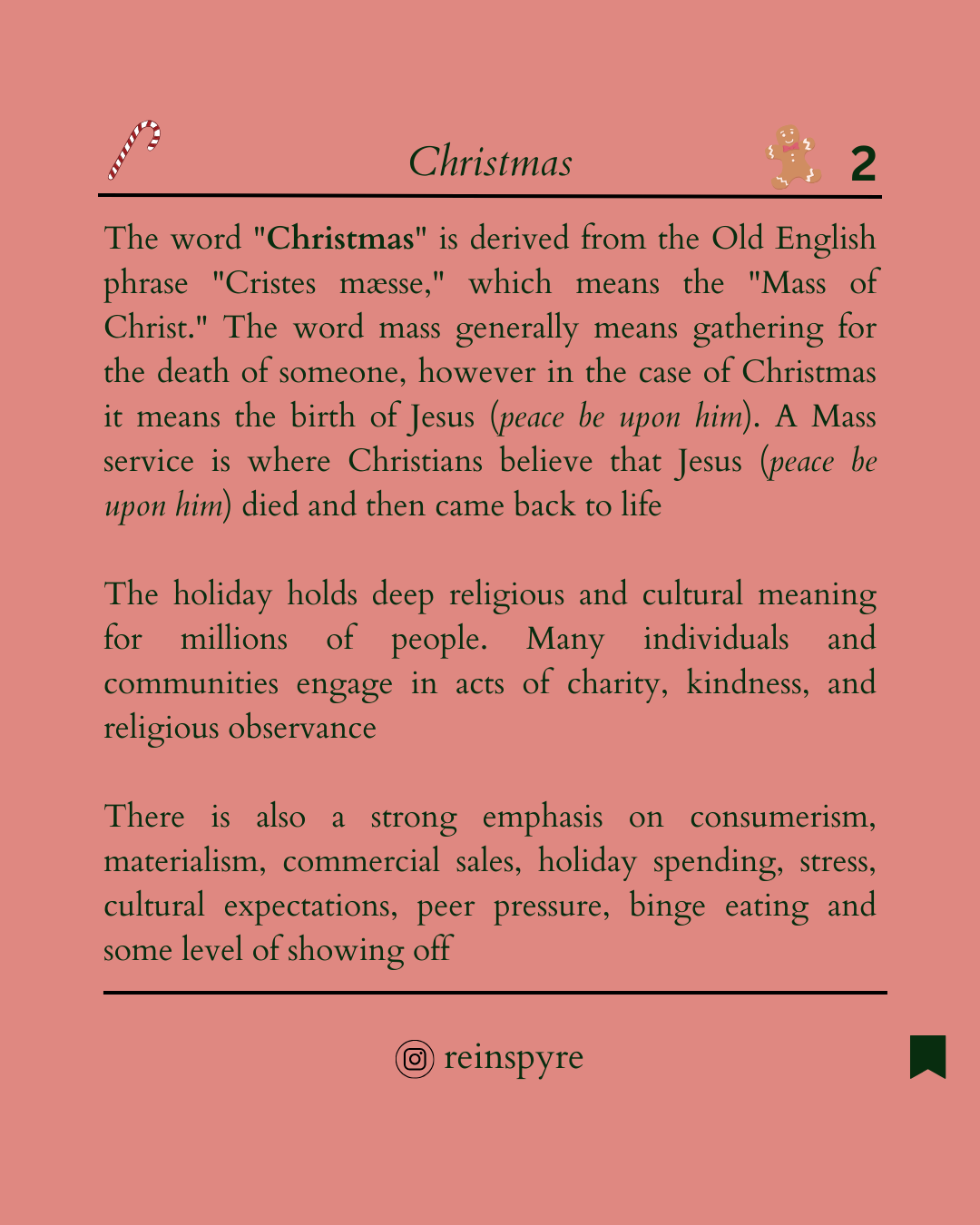 The word “Christmas” is derived from the Old English phrase “Cristes mæsse,” which means the “Mass of Christ.” The word mass generally means gathering for the death of someone, however in the case of Christmas it means the birth of Jesus (peace be upon him). A Mass service (which is sometimes called Communion or Eucharist) is where Christians believe that Jesus (peace be upon him) died and then came back to life