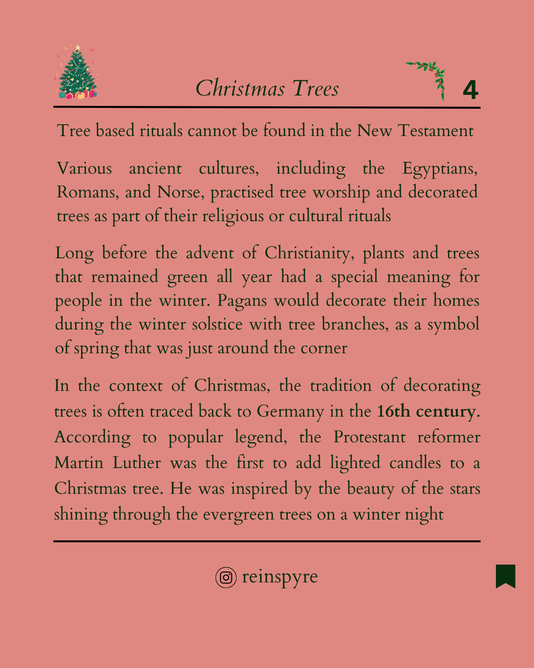In the context of Christmas, the tradition of decorating trees is often traced back to Germany in the 16th century. According to popular legend, the Protestant reformer Martin Luther was the first to add lighted candles to a Christmas tree. He was inspired by the beauty of the stars shining through the evergreen trees on a winter night.