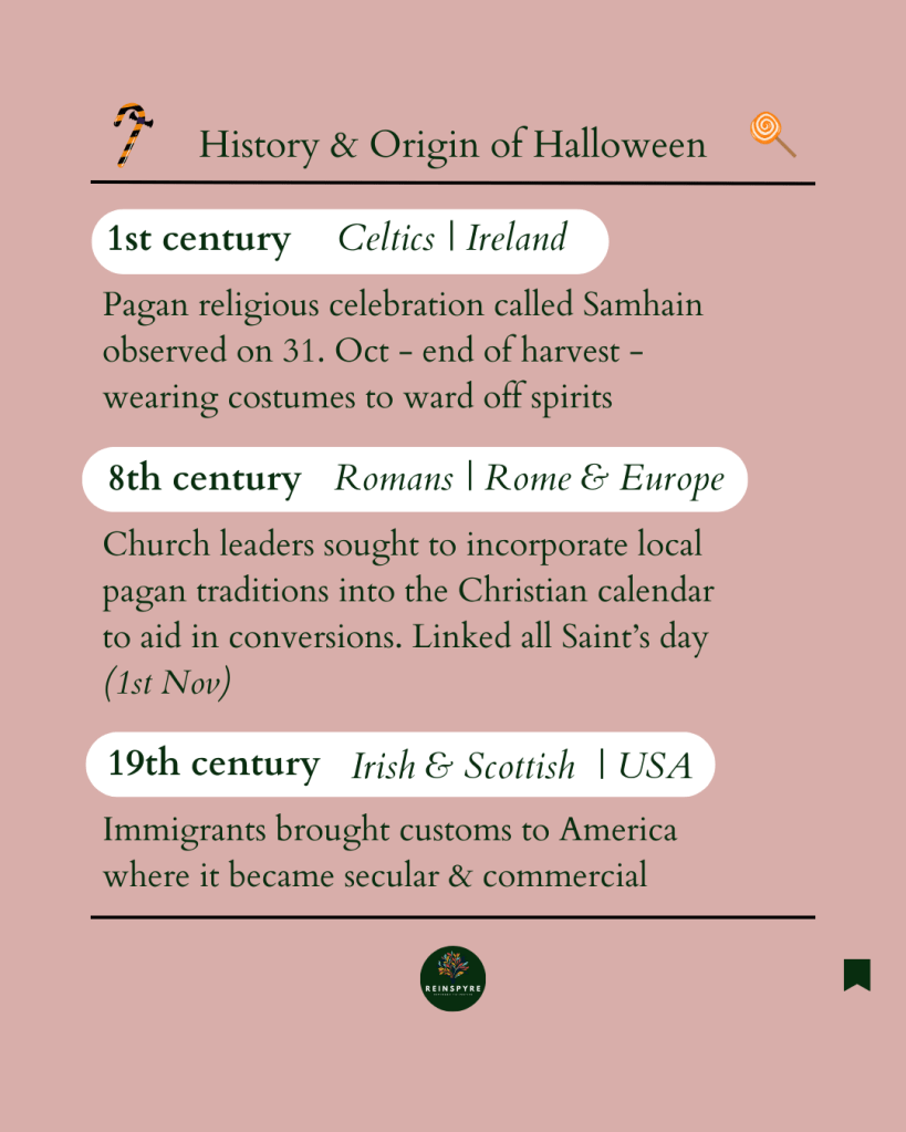 Halloween originated from the ancient Celtic festival of Samhain, which was celebrated on October 31st. This festival marked the end of the harvest season and the beginning of winter, a time when Celts believed the boundary between the living and the dead was blurred. They lit bonfires and wore costumes to ward off spirits. Samhain is name for the month of November in gaelic