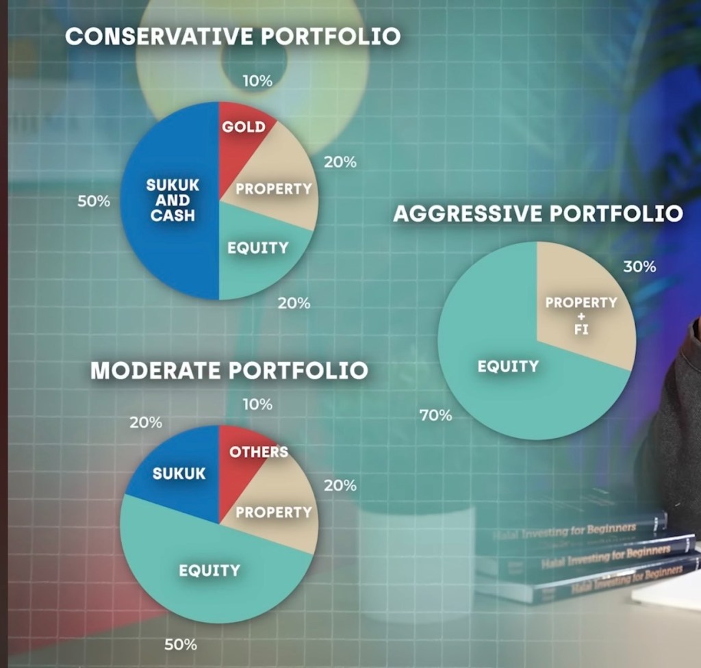 - 50% Stocks and Equity (high growth and conservative). Islamic index funds or ETFs